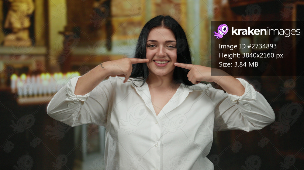 Woman smiling indoors in a church setting pointing to her cheeks with candles in the background showcasing a serene atmosphere.
