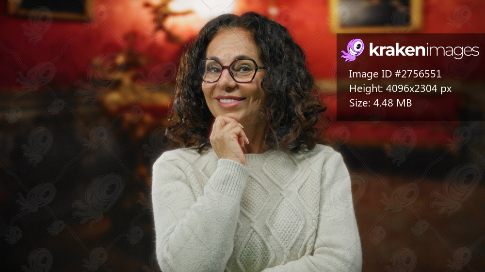 Woman smiling indoors in a luxurious hotel reception, wearing glasses and a sweater, with a vibrant red background, curly hair, mature, elegant, hispanic, and confident. - Kraken Images