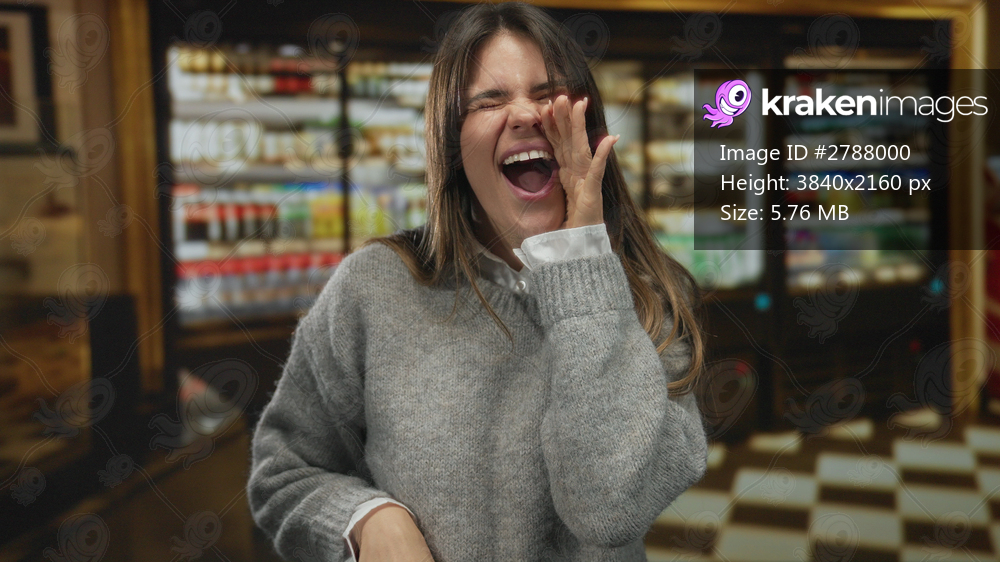 Woman smiling indoors in restaurant setting with refrigerated shelves in the background, exuding youthful energy and joy while wearing a cozy outfit, perfect for lifestyle themes. - Kraken Images