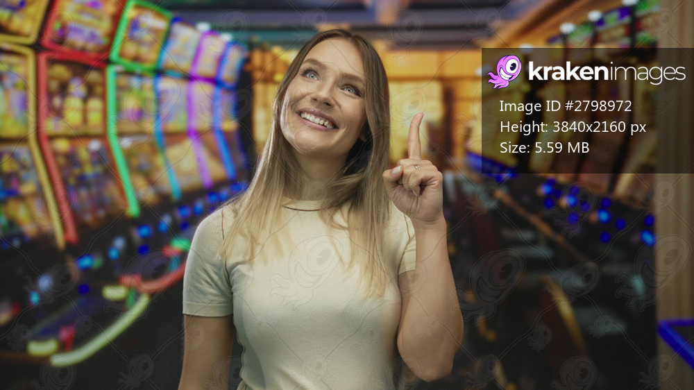 Woman smiling indoors, pointing up at colorful slot machines in a lively casino setting, creating a cheerful atmosphere.