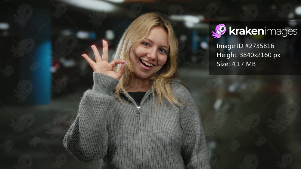 Woman smiling indoors showing ok gesture in a parking area with blurred cars in the background, wearing a gray sweater, blonde hair, suggesting confidence and positivity. - Kraken Images