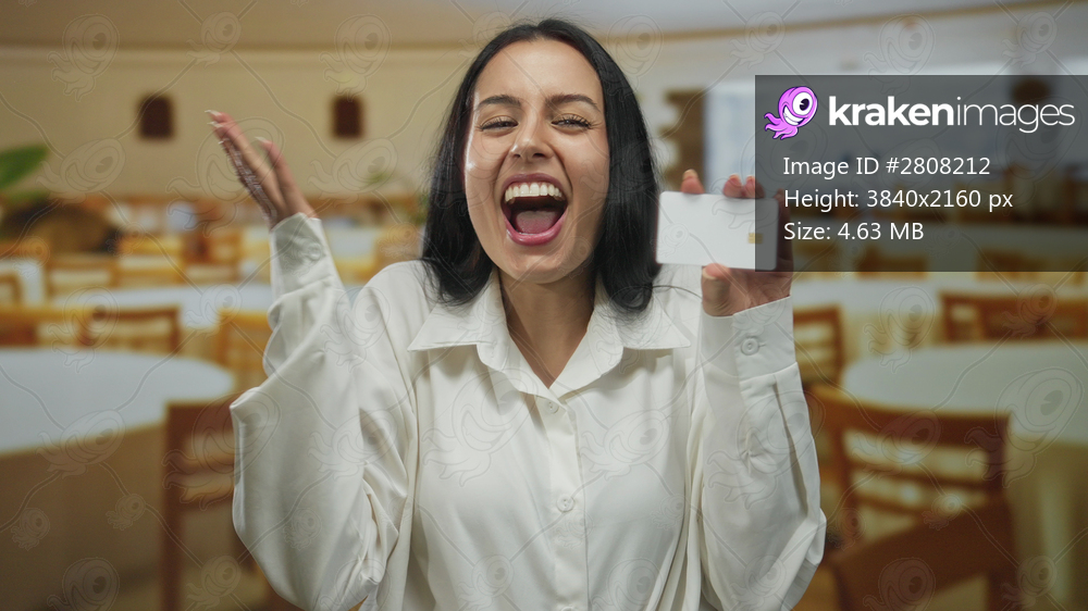 Woman smiling inside a restaurant holding a card, exuding happiness and excitement in a vibrant coffee shop setting, showcasing joy, celebration, and cheerful indoor atmosphere. - Kraken Images