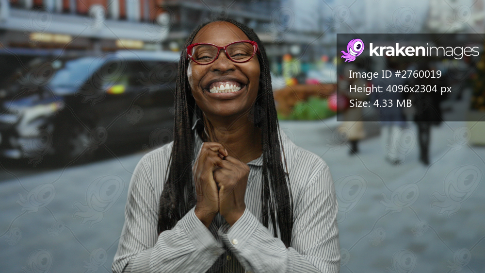 Woman smiling with joy on a busy urban street, wearing glasses and braids, surrounded by city life and blurred vehicles, capturing a happy moment.
