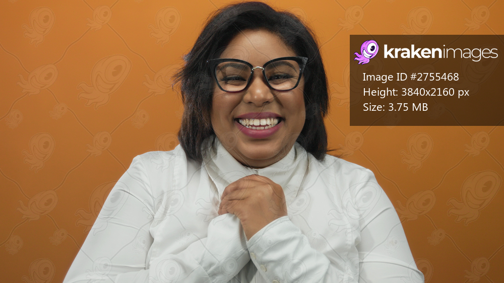 Woman smiling with joy on orange background wearing glasses and white shirt expressing happiness and positivity in a vibrant isolated studio setting.