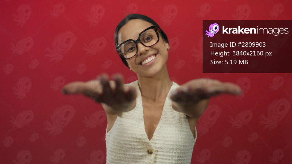 Woman smiling joyfully against a vibrant red background, showcasing glasses and a white top, exuding confidence and happiness with a friendly pose.