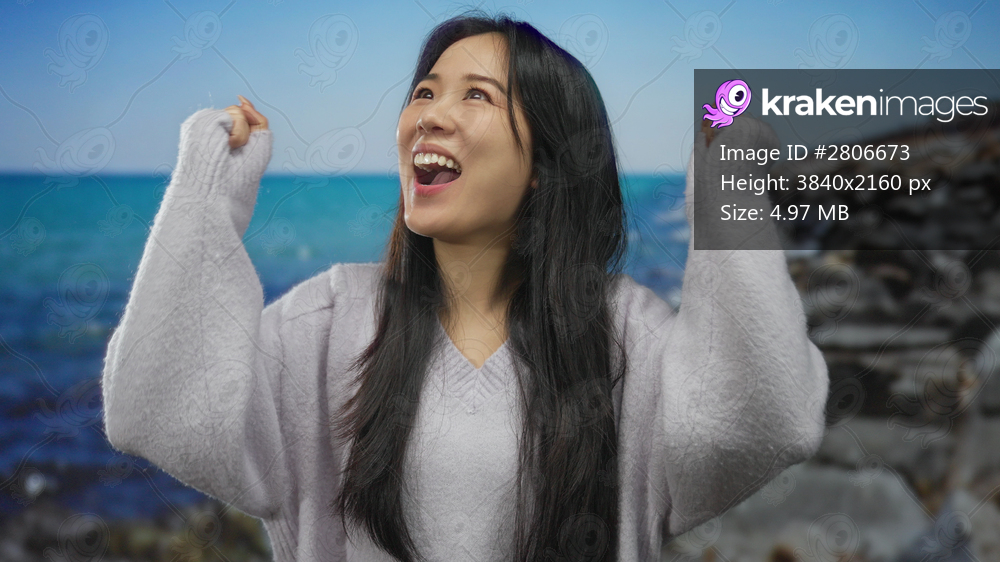 Woman smiling joyfully by the seaside displays happiness on a bright beach day with serene ocean and rocky shore in the picturesque outdoors.