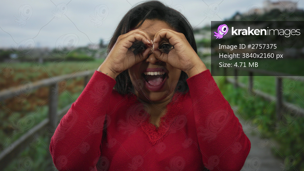 Woman smiling joyfully in a park wearing red sweater making binocular gesture hands plus size outdoors sunny day vibrant cheerful nature background carefree - Kraken Images