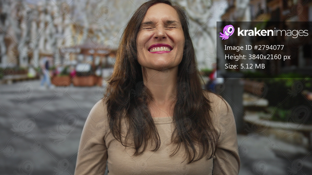 Woman smiling joyfully on a vibrant city street, her natural beauty and happiness reflecting a lively outdoor setting surrounded by blurred architectural details. - Kraken Images