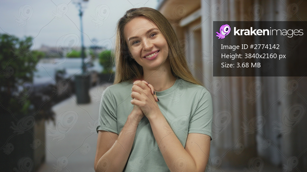 Woman smiling joyfully on city street with hands clasped in a hopeful gesture surrounded by urban scenery and greenery in an outdoor setting.