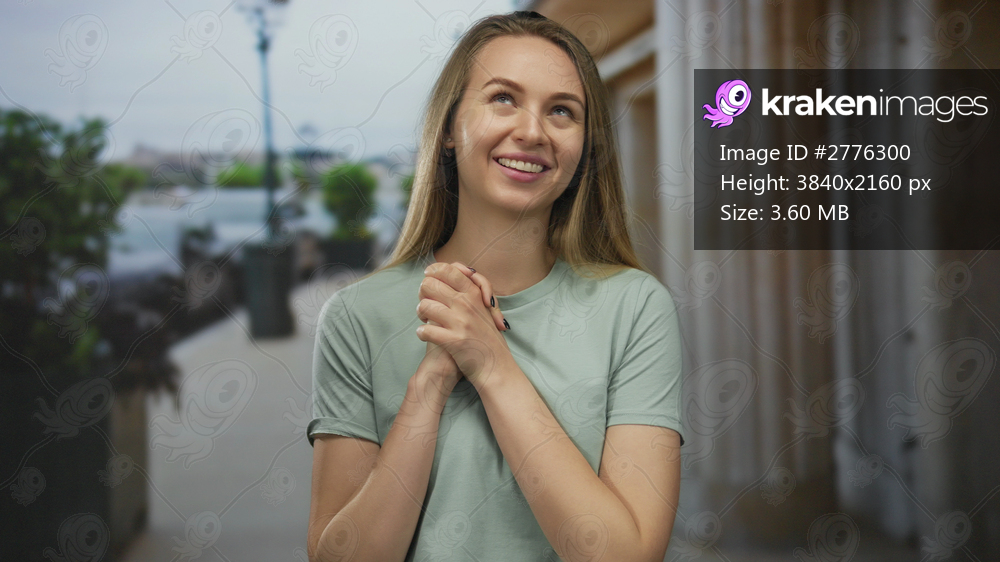 Woman smiling joyfully on city street with hands clasped in a hopeful gesture surrounded by urban scenery and greenery in an outdoor setting.