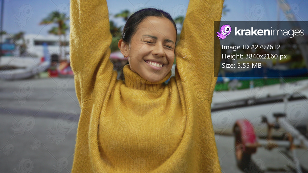 Woman smiling joyously on a sunny day at a seaside port with boats in the background, wearing a cozy yellow sweater, capturing the essence of outdoor relaxation. - Kraken Images