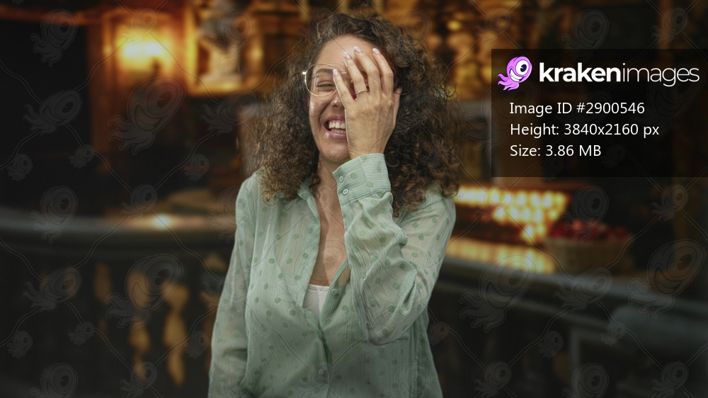 Woman smiling and laughing, wearing glasses and a light blouse, standing inside a church building by votive candles; joy and faith.