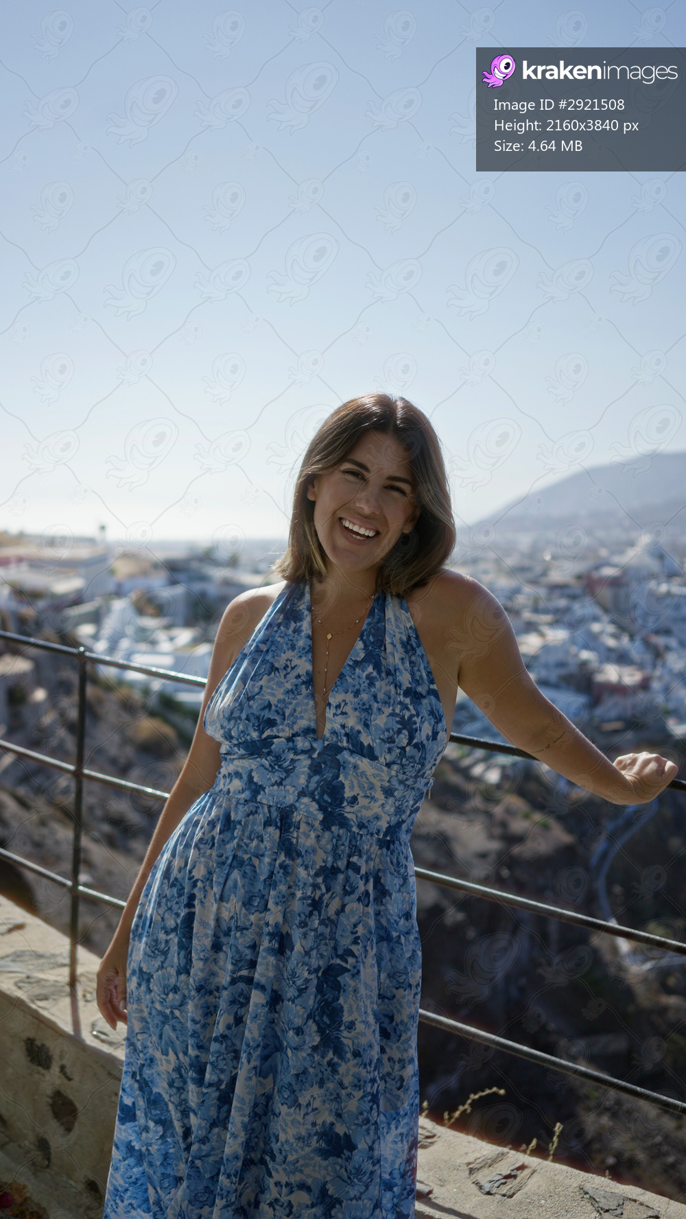 Woman smiling and leaning on a railing at a building viewpoint in santorini, greek island; travel vacation serenity.