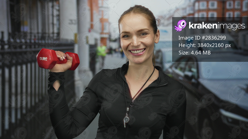 Woman smiling and lifting red dumbbell on a busy city street during outdoor fitness session; empowerment.