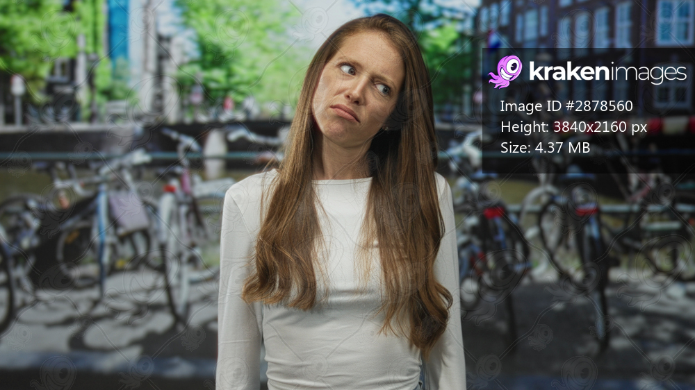 Woman smiling with long brown hair and white top standing by bicycles on a street canal in amsterdam; contentment urban travel.