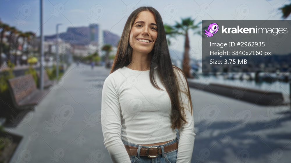 Woman smiling with long hair and hands at waist on a sunny street by a marina, wearing white shirt and jeans, facing camera; joyful confidence.