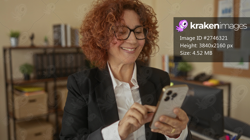 Woman smiling looking at smartphone in office with shelves computer desk plant books indoor work setting expressing happiness