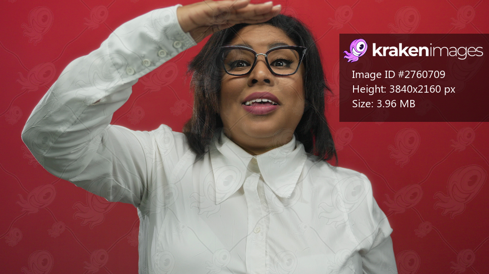 Woman smiling and looking into the distance standing against a vivid red background, featuring glasses and white shirt.