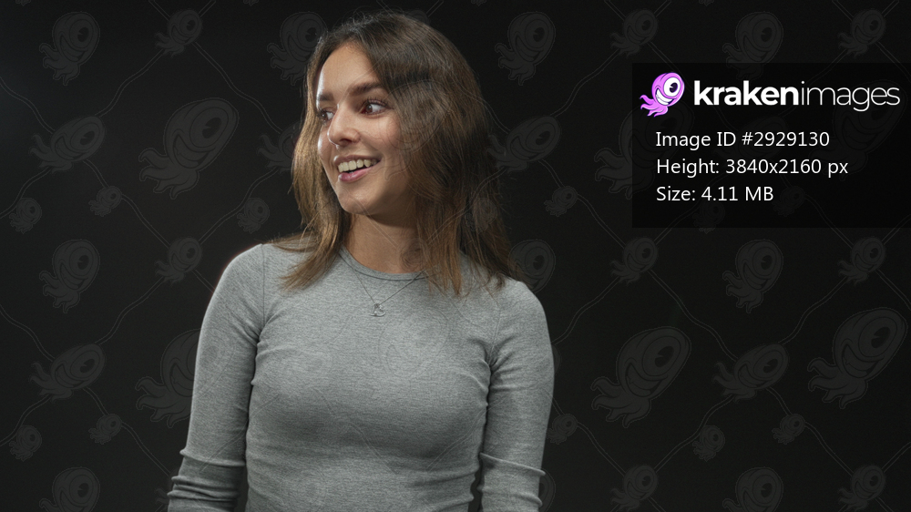 Woman smiling and looking right in black studio wearing grey shirt and heart necklace; friendly warm joy.