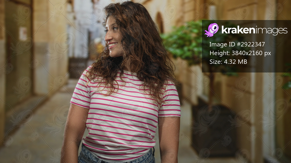 Woman smiling and looking sideways on a narrow cobblestone street lined with planters and stone buildings; joy carefree travel.