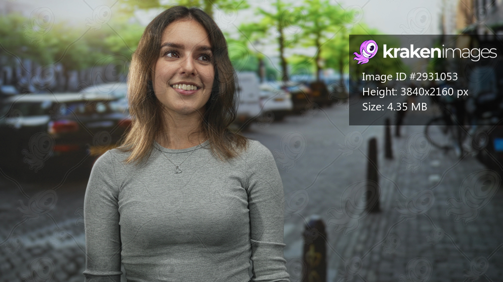 Woman smiling and looking to the side wearing a heart necklace on a city street; happiness warm everyday moment.