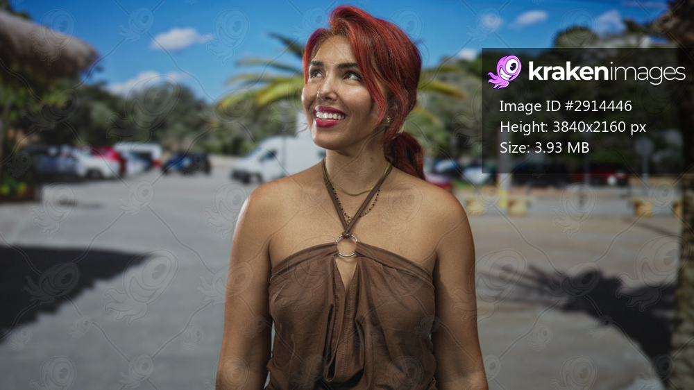 Woman smiling and looking up, bare shoulders and necklace visible while standing in a sunlit street parking area; optimism hope wanderlust.