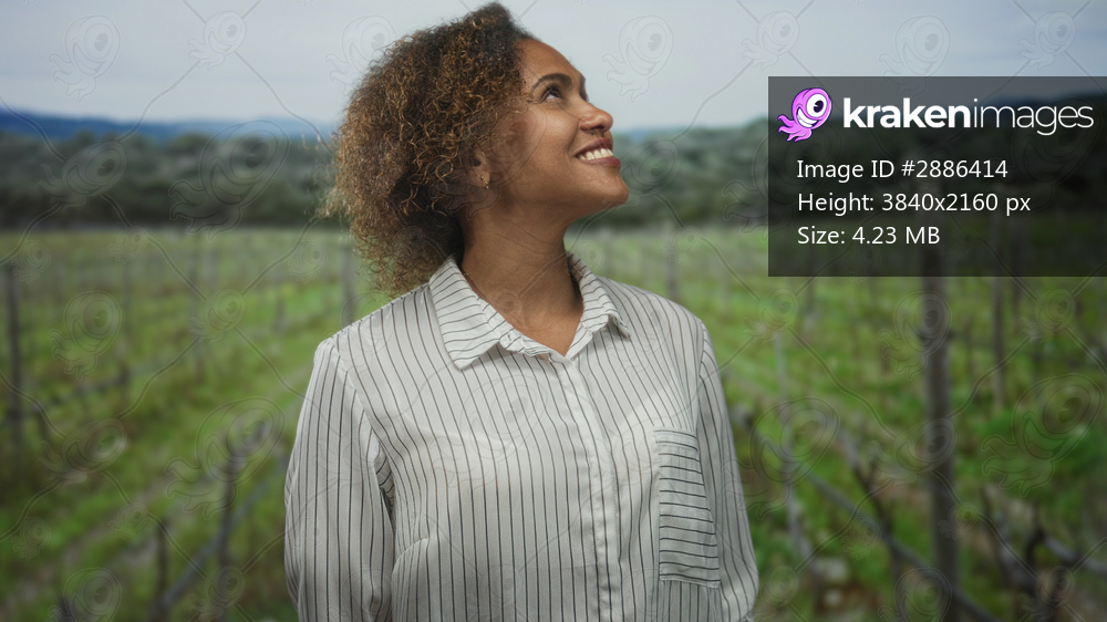 Woman smiling and looking up in a vineyard field, wearing a striped shirt with hands behind back and relaxed posture; joy openness calm.