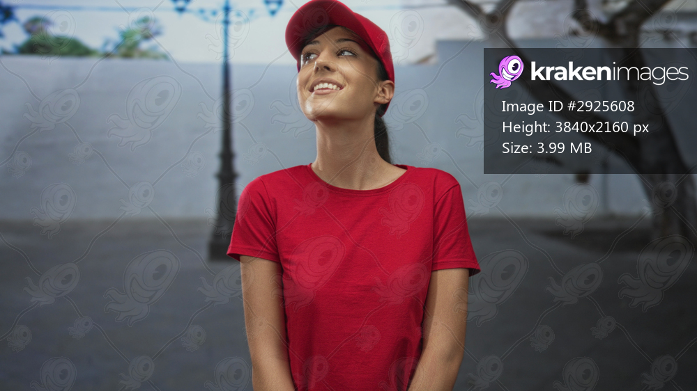 Woman smiling and looking up in red cap and red t shirt on street by lamppost and tree, arms relaxed at sides, casual look; youthful optimism.