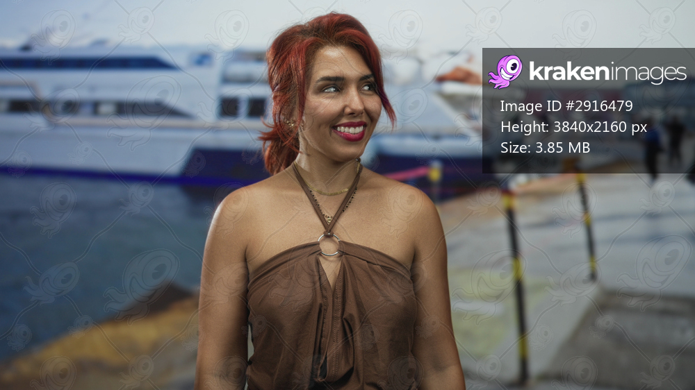 Woman smiling and looking up on a street near docked boats with bare shoulders visible, red hair tied back and wearing a necklace; serenity travel.