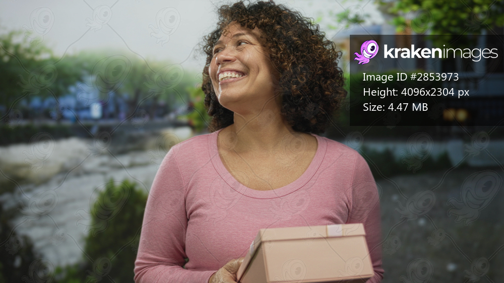 Woman smiling and looking up while holding pink giftbox on street in amsterdam canal district; happiness.