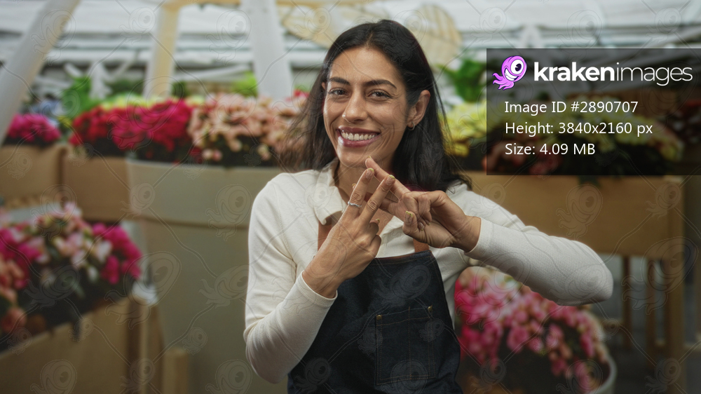 Woman smiling makes hashtag with fingers in building full of flowers and market stalls; community joy.