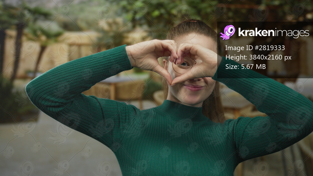 Woman smiling makes heart gesture with her hands on an outdoor restaurant terrace building; love joy.