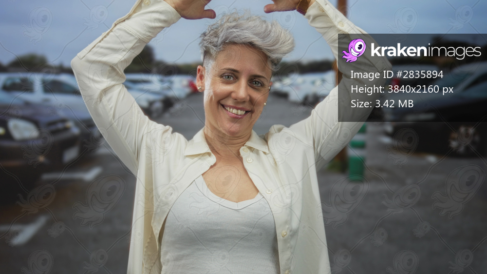 Woman smiling makes roof gesture with hands on her head in street scene with white cars and pale blue sky; joy.