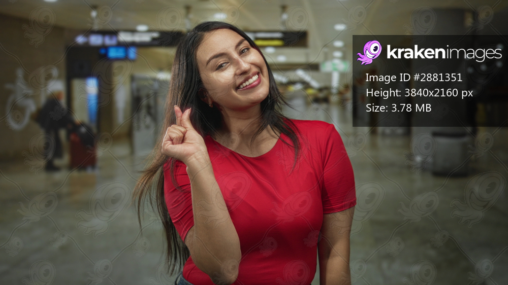 Woman smiling and making a finger heart with her hand in an airport terminal wearing a red top; joyful travel moment.