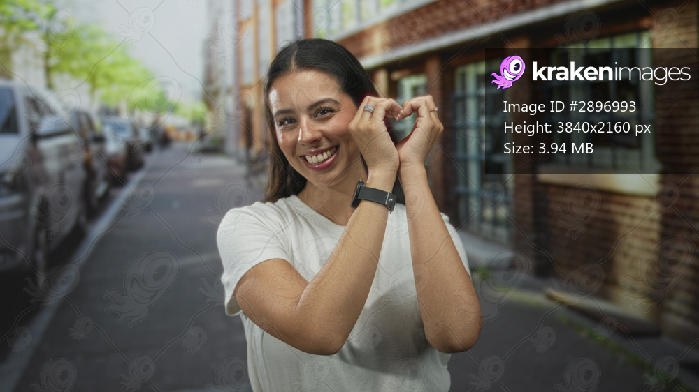 Woman smiling and making a heart with her hands on a city street in daylight, wearing a white t shirt and watch; joy love.