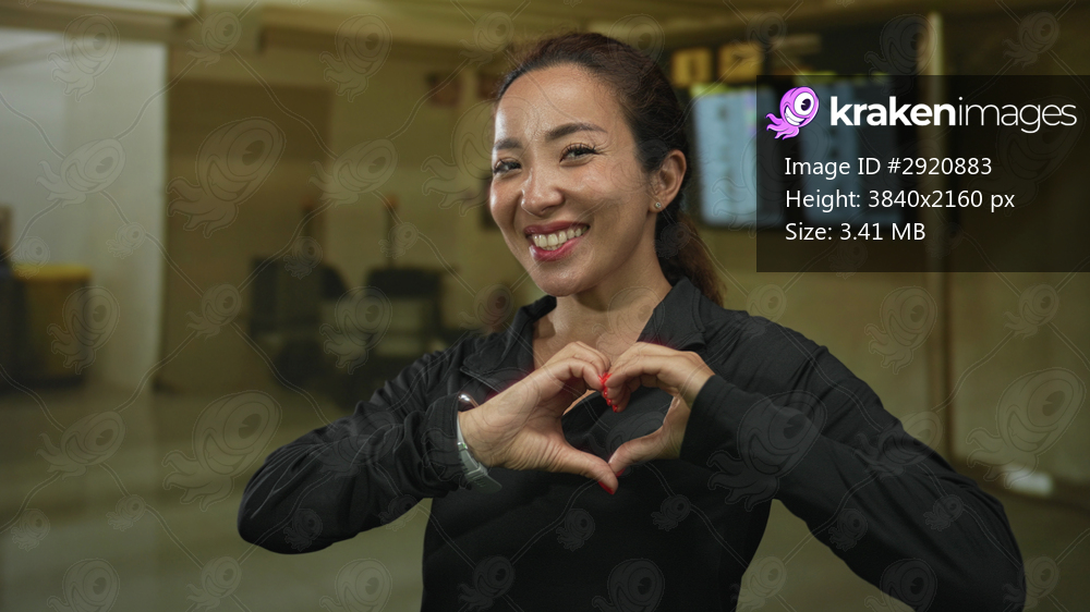 Woman smiling and making a heart shape with her hands in an airport terminal by flight information screens while wearing a black jacket; kindness joy.
