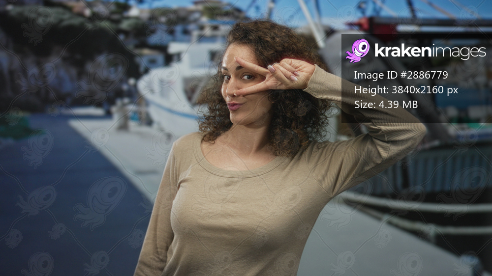 Woman smiling and making a peace sign with hand by her eye at a marina dock with boats and quay visible; playful joy.