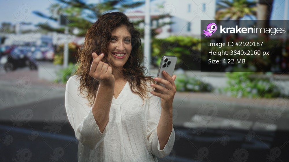 Woman smiling and making finger heart with hand while holding smartphone on street; digital connection joy.