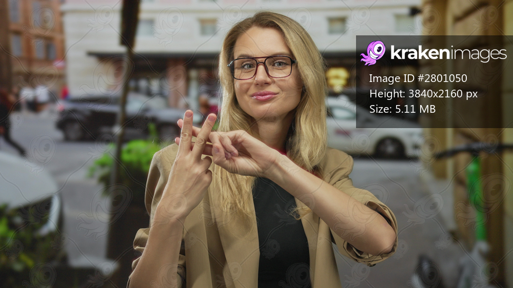 Woman smiling making hashtag gesture on busy city street showcasing urban lifestyle with blonde hair glasses and casual beige jacket outdoors daytime.
