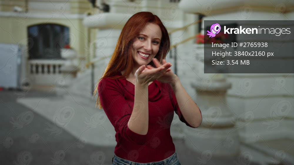 Woman smiling and making money gesture outdoors in urban city street, showcasing joy and confidence in a casual outfit.
