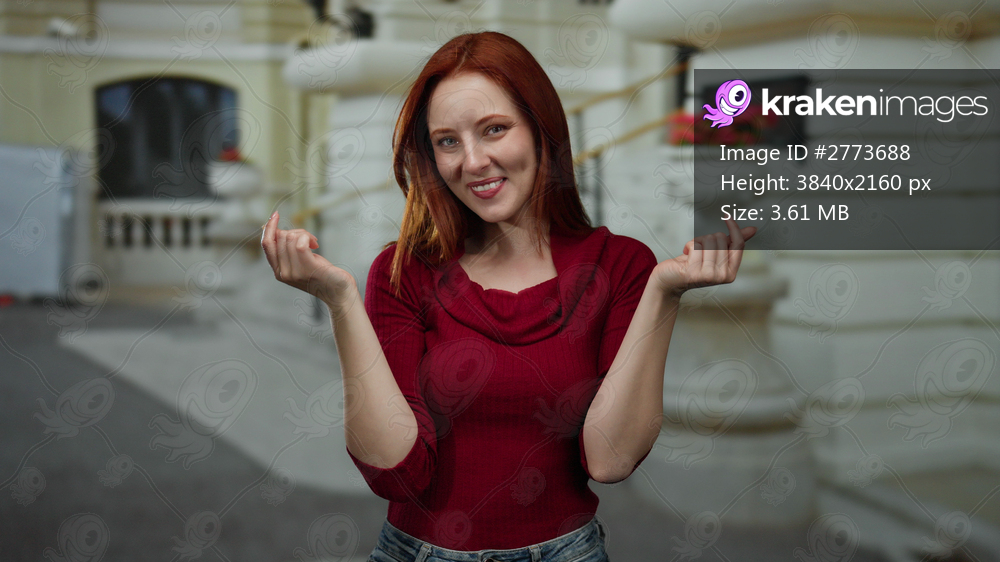 Woman smiling and making money gesture outdoors in urban city street, showcasing joy and confidence in a casual outfit.