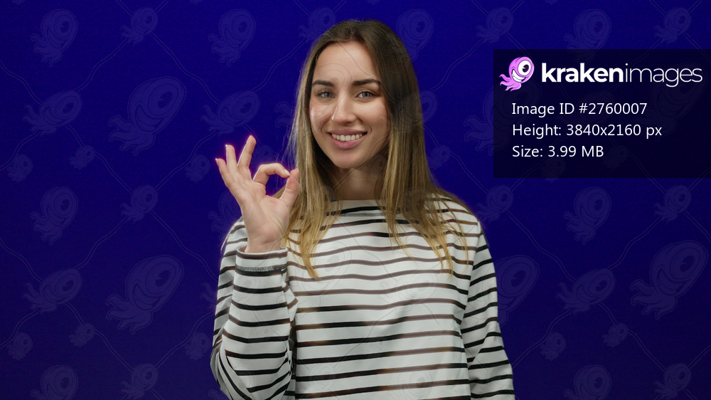 Woman smiling and making ok gesture in front of isolated blue wall, wearing striped shirt, young and blonde with long hair, positive expression, vibrant background scene - Kraken Images
