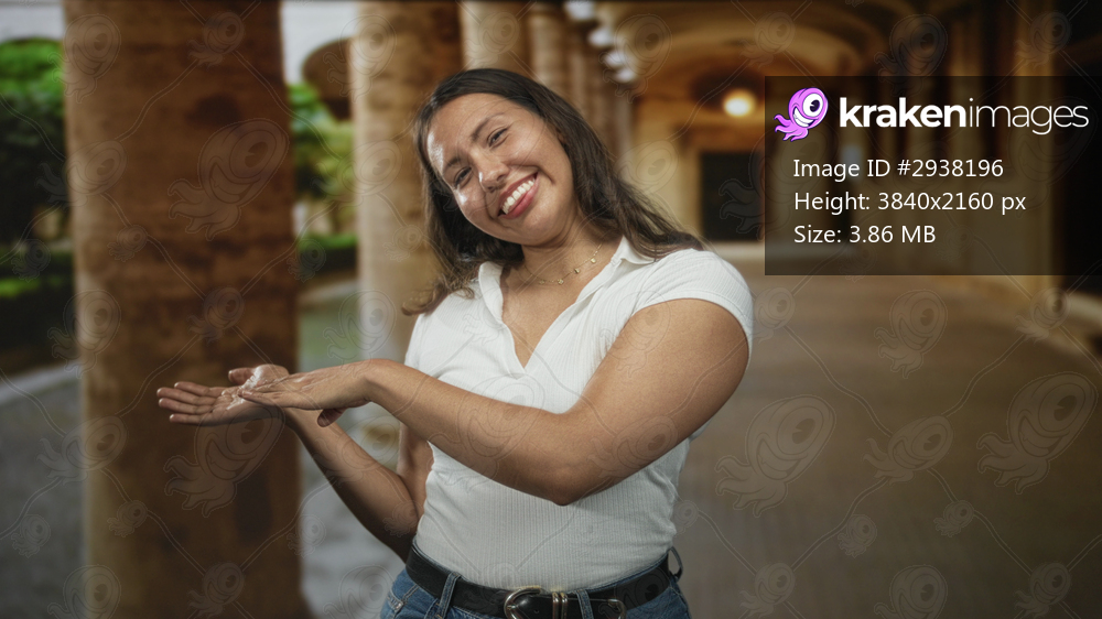 Woman smiling and making ok sign with bare hand, wearing white shirt and jeans in a historic building corridor; confidence greeting.