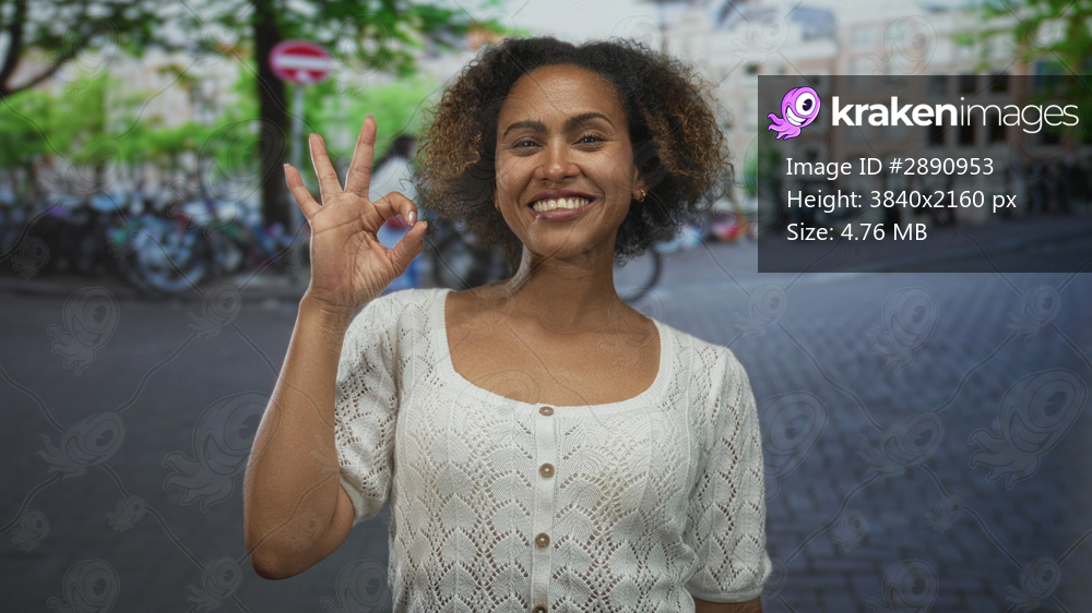 Woman smiling and making ok sign with hand on a street with bicycles and buildings, wearing white knit sweater; approval joy.