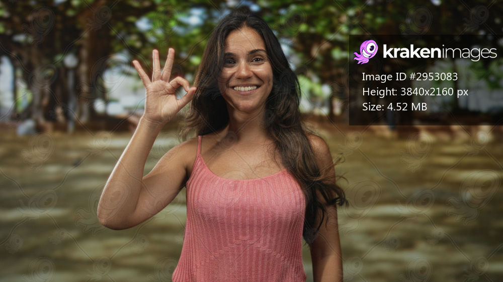 Woman smiling and making ok sign with hand showing exposed shoulder in forest among sunlit trees and walking path; confidence approval.