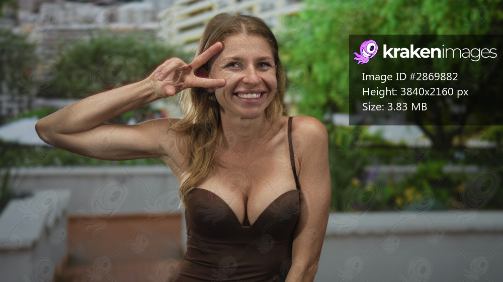 Woman smiling and making peace sign by eye, cleavage visible in brown swimsuit on sunlit building terrace; playful confidence.
