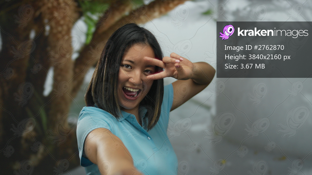 Woman smiling and making peace sign outdoors in a vibrant city setting, embodying youthful energy and playful spirit during a sunny day.