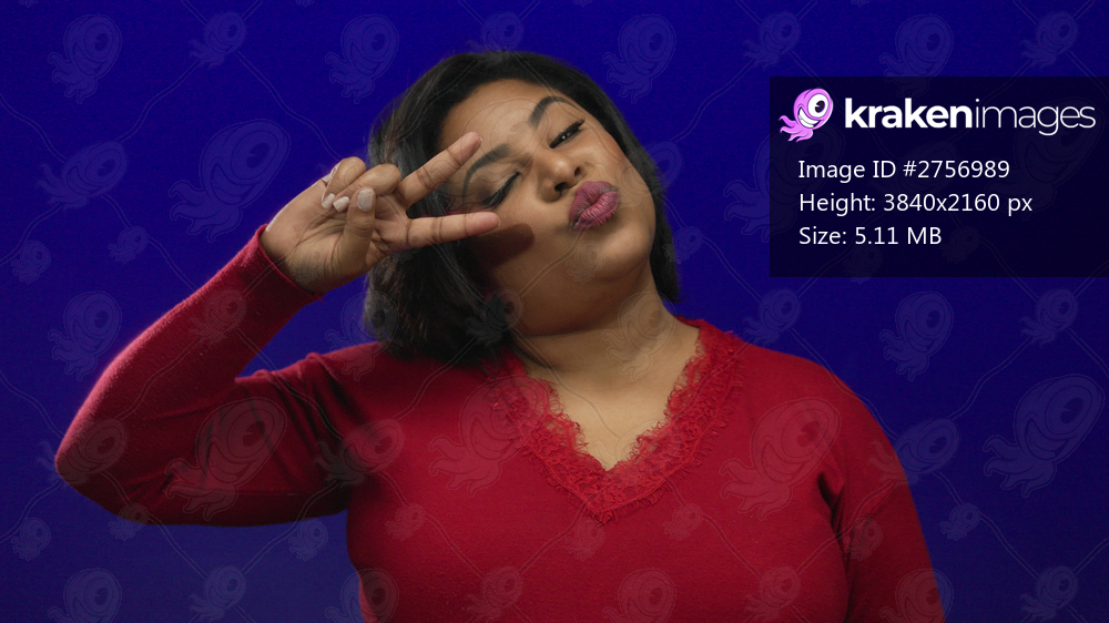 Woman smiling making peace sign over blue background wearing red shirt suggesting positivity and warmth