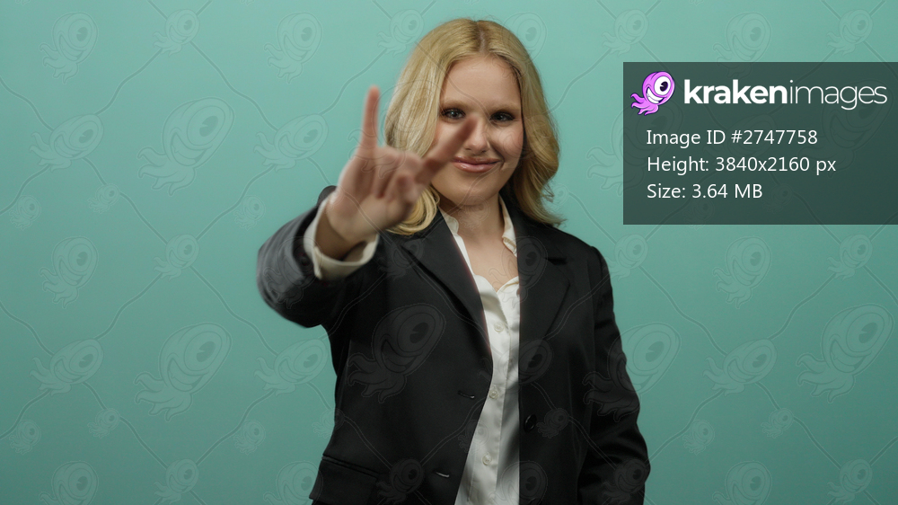 Woman smiling making rock gesture with hand against vibrant green backdrop wearing black formal jacket white blouse blonde hair conveying confidence and positivity in business setting. - Kraken Images