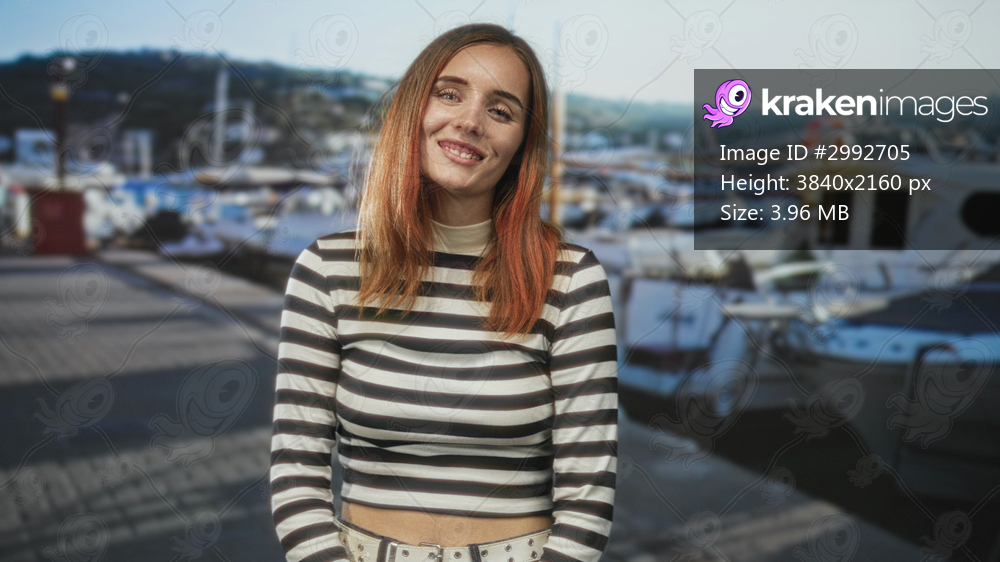 Woman smiling with midriff visible in striped crop top at a marina dock with moored boats and yachts in daylight; carefree joy.